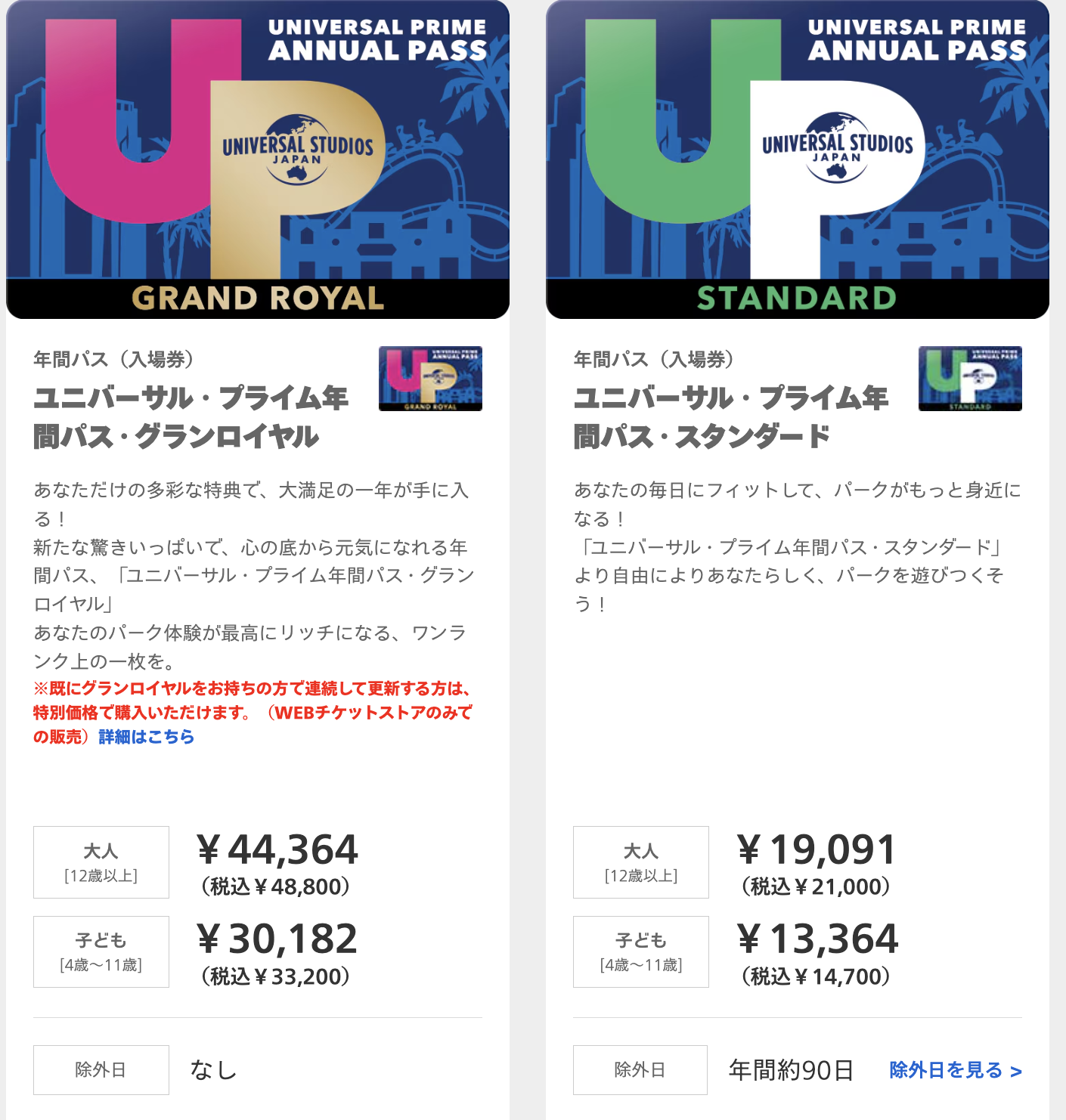 販售的年票有二種,分別是グランロイヤル(Grand Royal)與スタンダード(Standard),差別是在特定日期的除外日(約90天)是否能入場,價格也差了一倍多。
