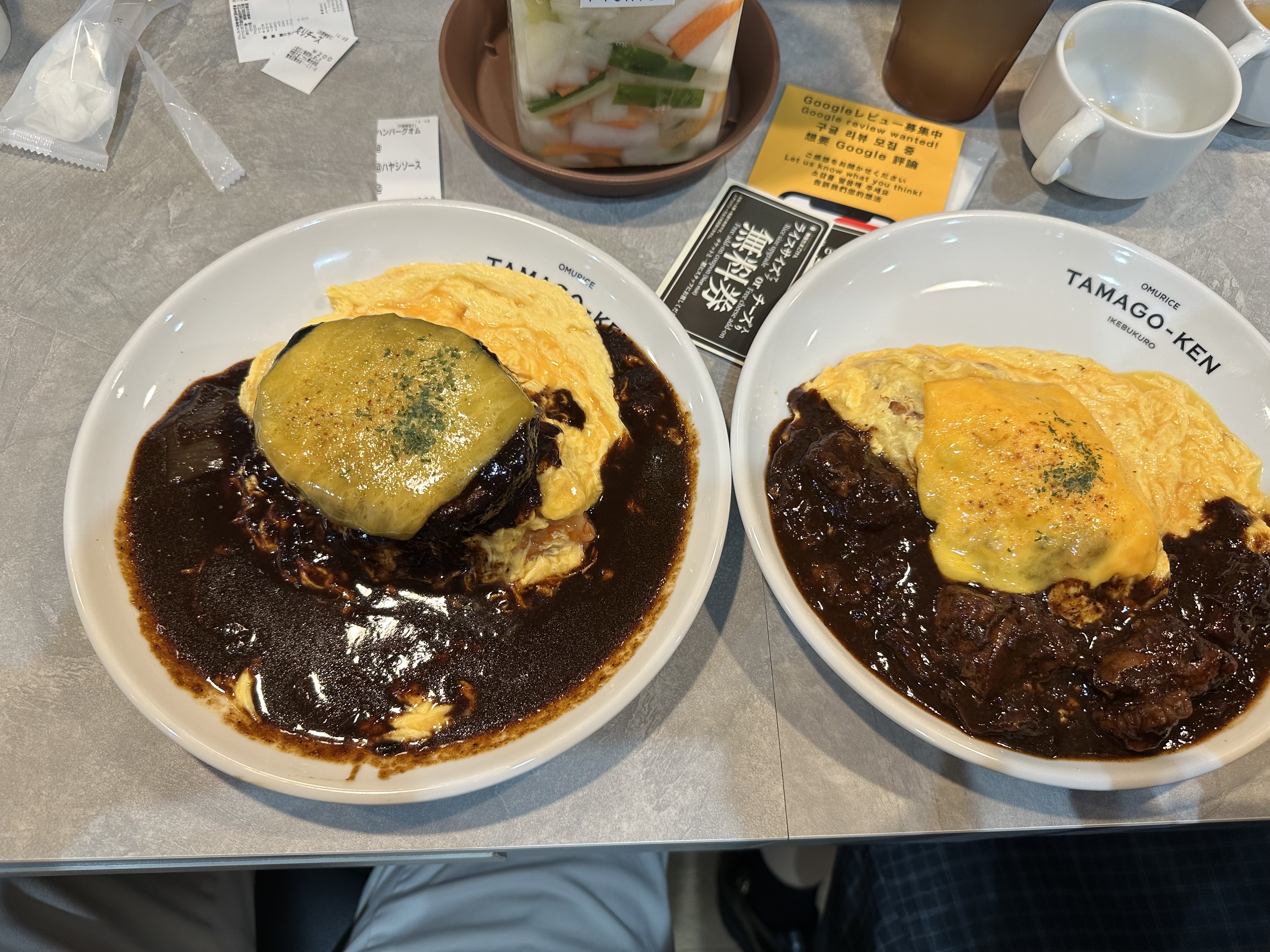 接著就到池袋附近找原本要吃的蛋包飯(yellow 池袋),但實在排太長,就找了間附近的備案,點了漢堡排跟牛肉咖哩蛋包,都加了炙燒起司,味道還不錯。